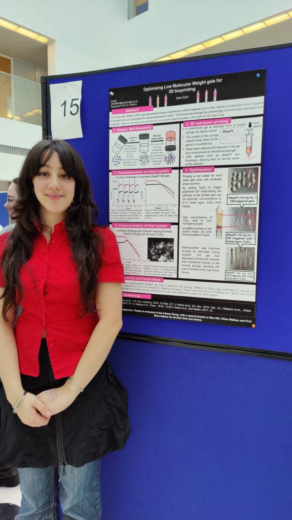 Asra presented a poster on her final year project last Friday. Her project was on optimizing low molecular weight gels for 3D printing.