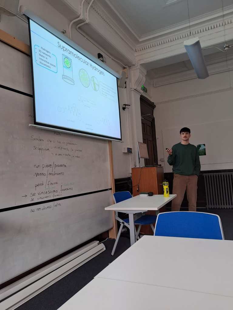 Fin presented his masters project presentation on Inducing Alignment of Micellar Structures in Transient Hydrogel Systems. He has now handed in this thesis and completed the viva meaning he has now finished his masters project. Fin has been in the lab for the last 6 months working with Simona and we all wish him the best with the future. Maybe we’ll see him back at some point.