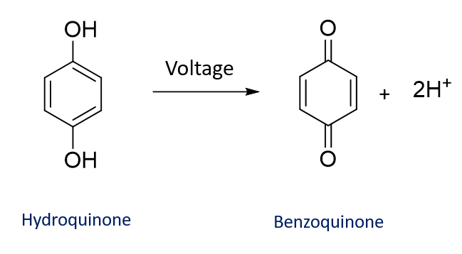 If a molecule can gel at a low pH (e.g. 2NapVG) then gelation can be induced by the electrochemical oxidation of hydroquinone to benzoquinone. This reaction generates protons at the electrode-solution interface leading to a localised drop in pH and therefore gel growth. This localised drop below the pKa of the gelator triggers gel growth on the electrode surface.