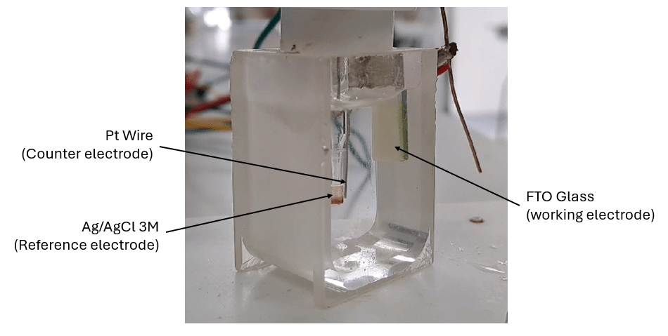 A three-electrode set-up is used consisting of a working electrode (FTO glass slide, 12 x 15 mm), reference electrode (aq. Ag/AgCl, 3 M) and counter electrode (platinum wire), in a glass beaker. To grow a hydrogels, the pH of a gelator solution (5 mg/mL) in NaCl (aq. 0.1M) is adjusted from pH 11 to pH 7. As the oxidation of HQ is accelerated at high pH, the adjustment of pH prevents the HQ in solution oxidizing before it can be consumed electrochemically. 7 mL of gelator solution containing HQ (5 mg/mL) is then pipetted into the glass beaker containing the three-electrode set-up. A galvanostatic current of current density 0.7 mA/cm2 is then applied to the working electrode (FTO slide) for 300 seconds.