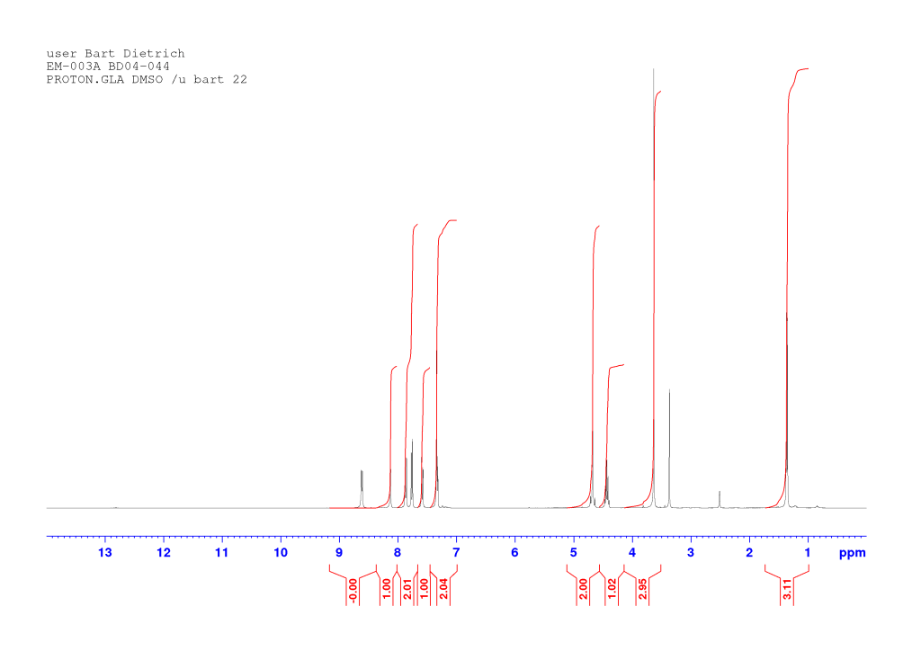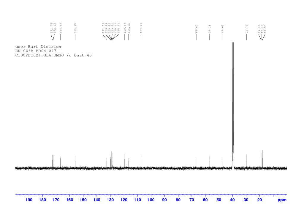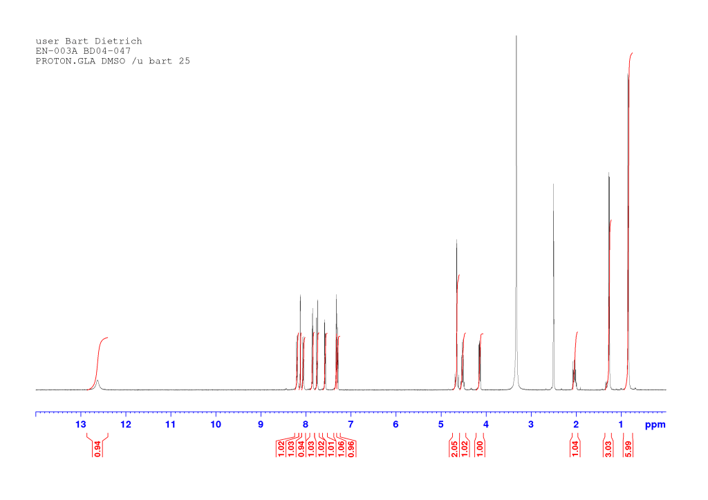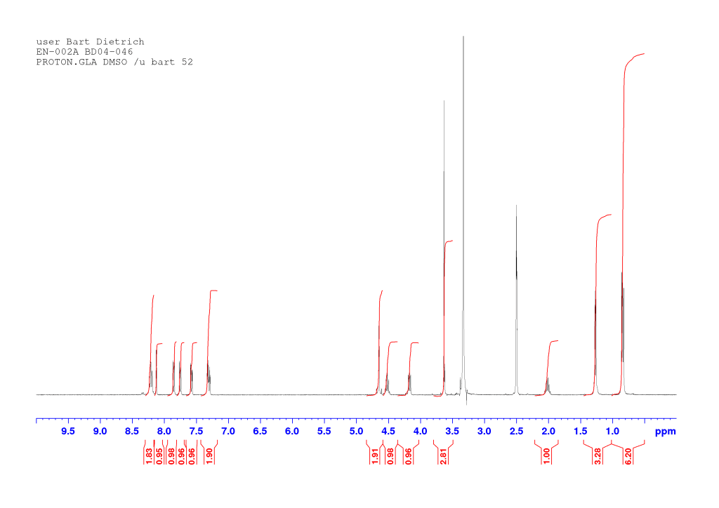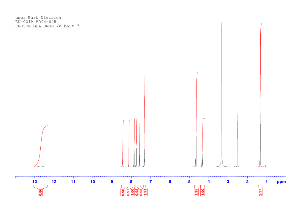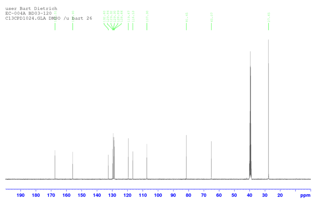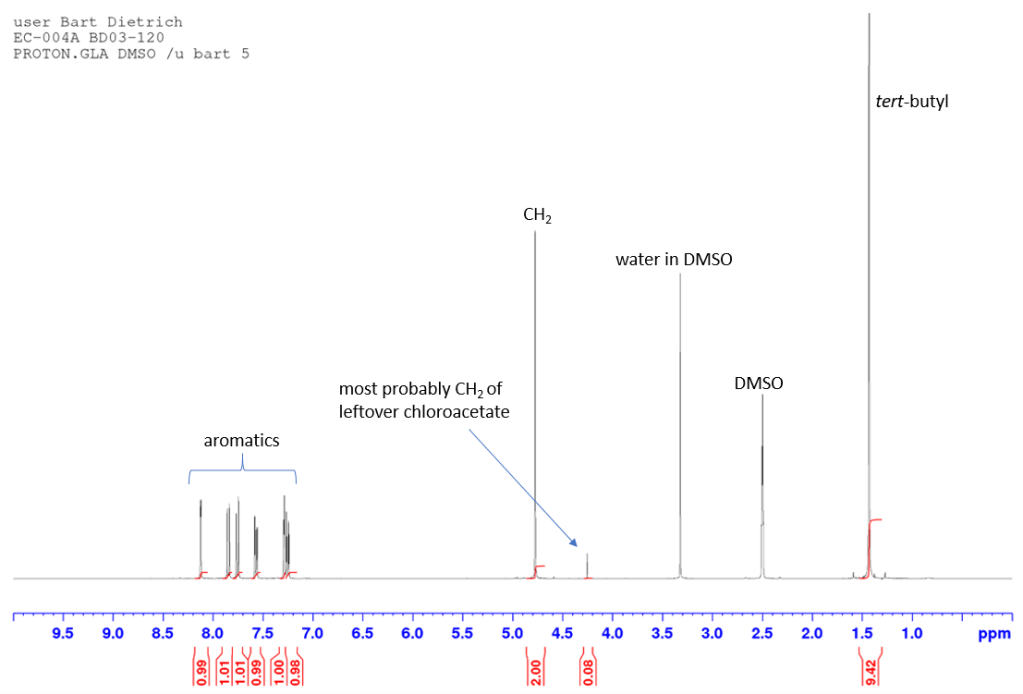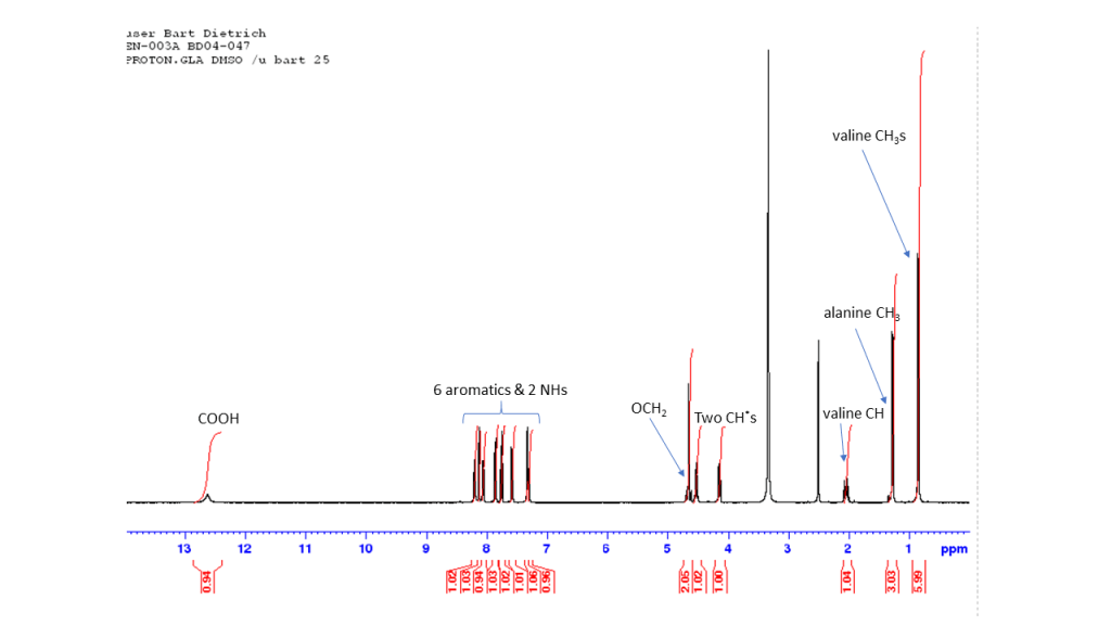 The proton spectrum also shows a small peak at 8.3 ppm: this is a small amount of residual chloroform. If you’re accustomed to deuterated chloroform for your NMR samples, this will take some getting used to: we generally used deuterated DMSO and chemical shifts for common solvents and impurities are all different in DMSO-d6 from what they are in CDCl3. See “NMR solvent peaks” under useful links. Also note the water peak. In DMSO-d6, this is usually fairly sharp and at 3.3 ppm. Here it is broad and around 3.5 ppm. Broadening and shifting of the water peak to the left of the spectrum indicates the presence of a small amount of residual acid (TFA). The further away from 3.3 ppm the water peak is, the more acid is present. Here it’s a fairly small amount but still noticeable. A small amount of residual acid will not interfere in the next step and so it was left as is (see paragraph about washing out the TFA below).