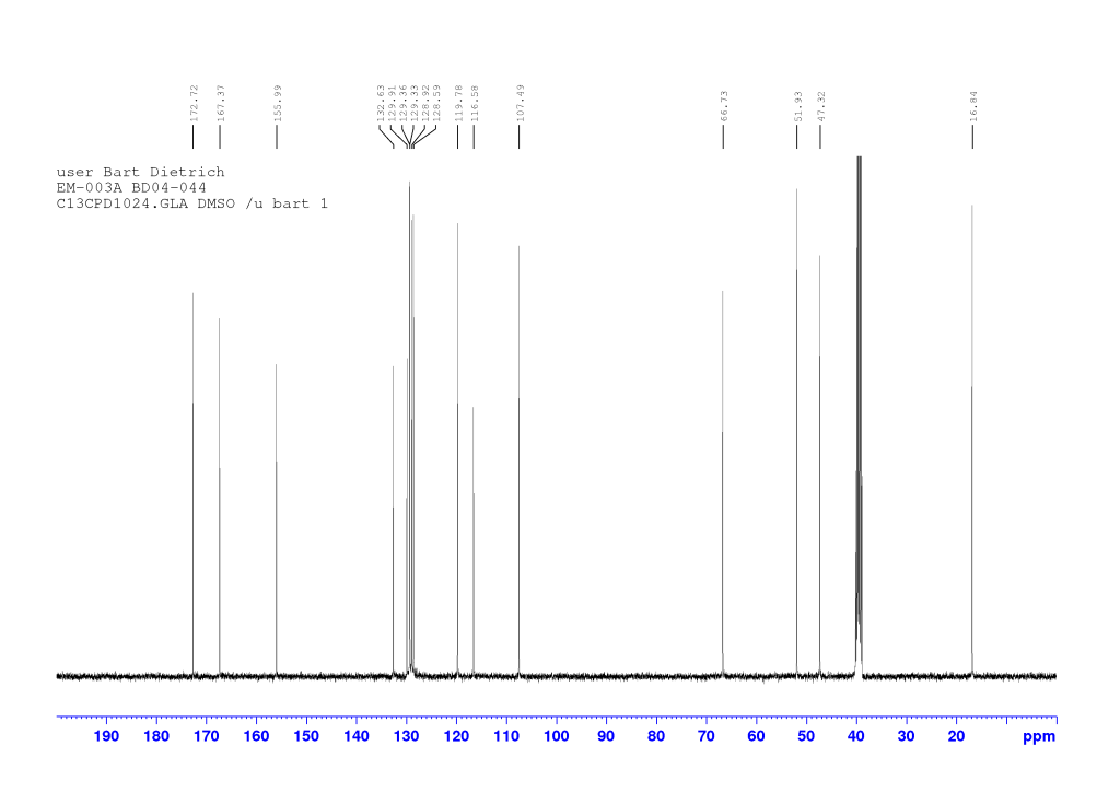 To a solution of EM-002 (2.96 g, 10.5 mmol) in chloroform (70 mL) was added isobutyl chloroformate (1.01 eq, 1.38 mL) followed by N-methylmorpholine (1.1 eq, 1.27 mL). After 10 minutes, L-alanine methyl ester hydrochloride (1 eq, 1.47 g) and another portion of N-methylmorpholine (1.1 eq, 1.27 mL) were added and the reaction was stirred overnight. It was then diluted with chloroform, washed with 1M hydrochloric acid and brine, dried (MgSO4), and evaporated under reduced pressure. The resulting cream solid (3.60 g, 94 % crude) was used as is for the next step. A small amount was purified via column chromatography (1:9 ethyl acetate/dichloromethane) to afford an analytical sample.