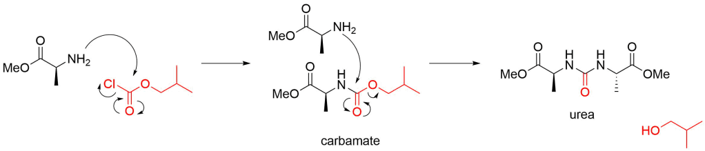 The order of addition of reagents is important in this reaction. The IBCF activates the carboxylic acid by forming a mixed anhydride. It is this mixed anhydride which subsequently reacts with the amine to give the product. It follows that the IBCF must be combined with the acid (EM-002 in this example) and NMM before the amine (alanine methyl ester hydrochloride in this example) is added. One equivalent of base (NMM) is required to mop up the HCl formed.