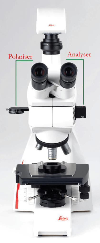 Position: The polarising filter, often simply called the “polariser,” is placed above the sample stage and below the polarising light source in the light path.