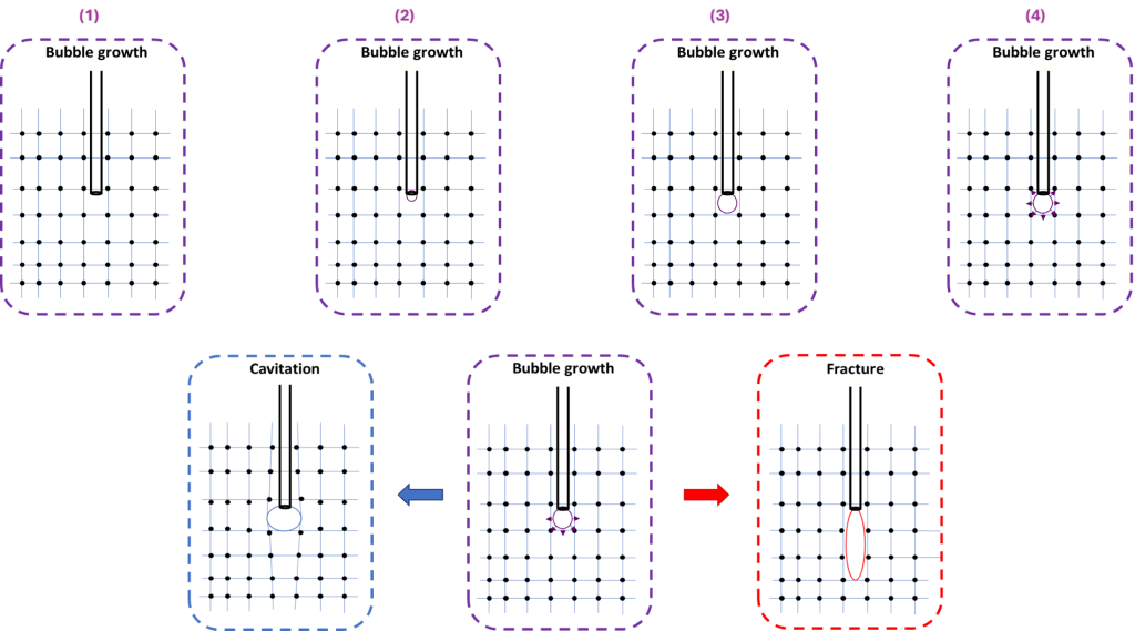 Cavitation is achieved by pumping a fluid (typically air, but water can also be used)4 through a needle into a soft material. Initially this will cause an increase in the pressure of the system (1). Eventually a small bubble will form at the tip of the needle (2). This exerts outwards pressure onto the surrounding material (3). As the material surrounding the bubble yields when then pressure is high enough, the bubble will rapidly and suddenly grow (or cavitate) (4). This is the critical pressure, PC.